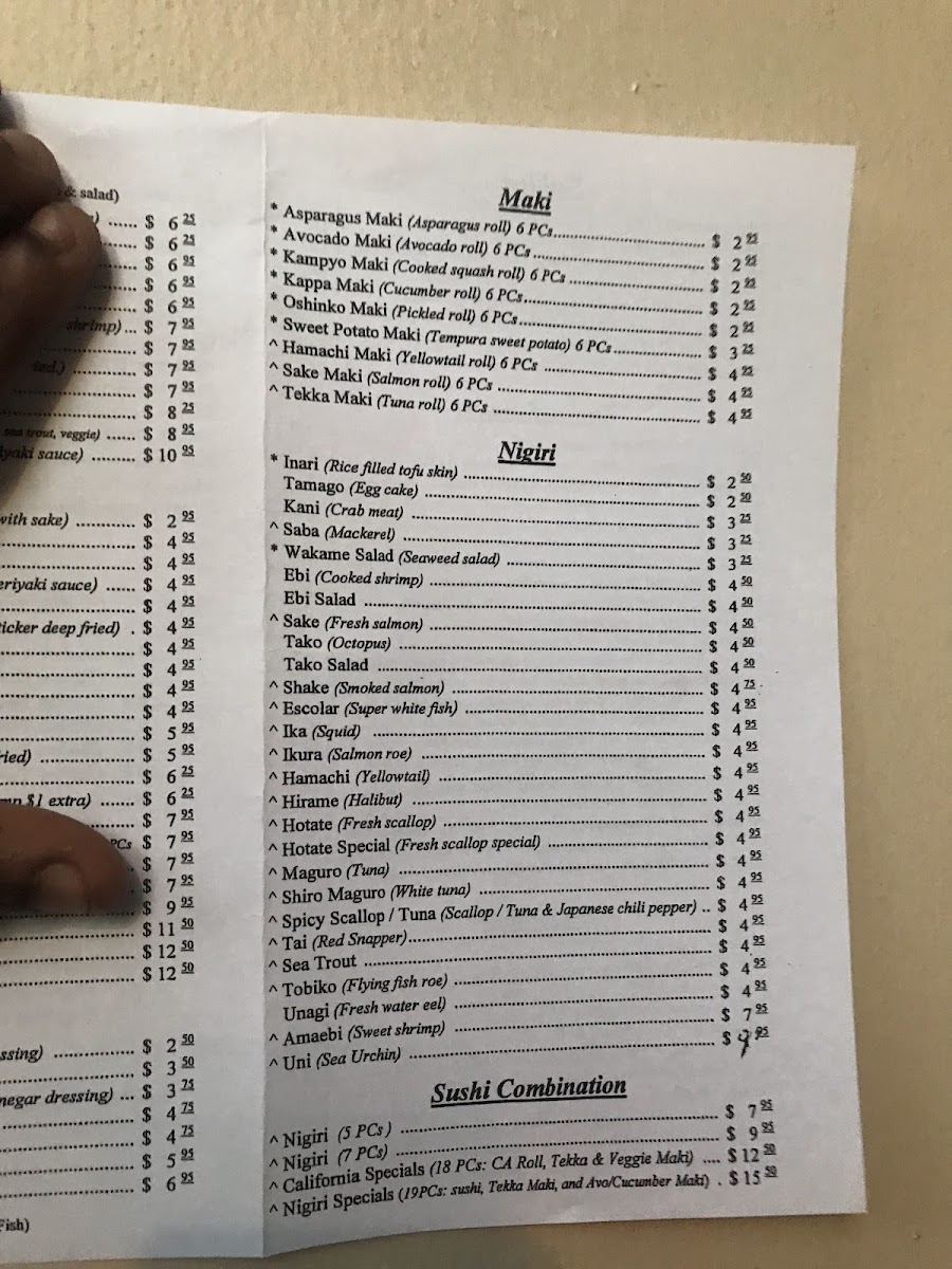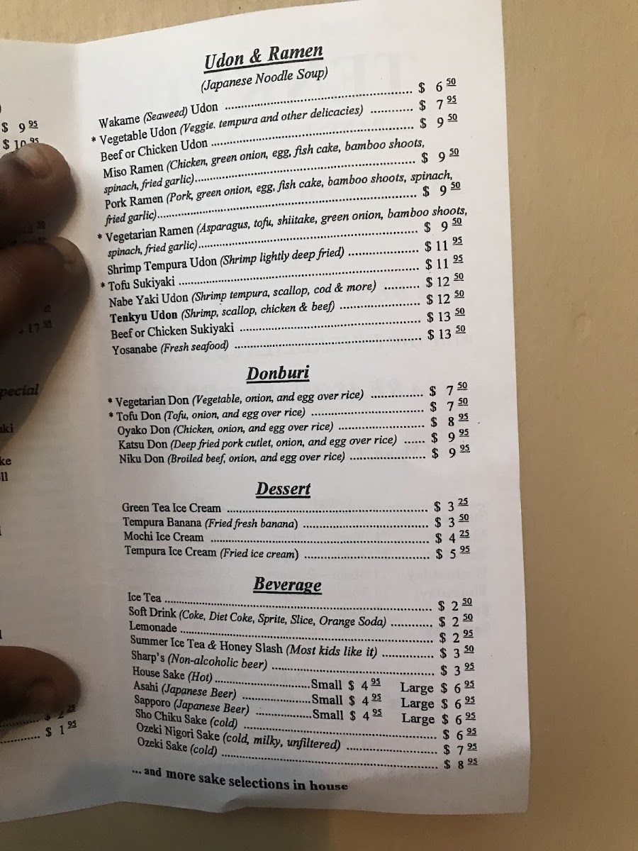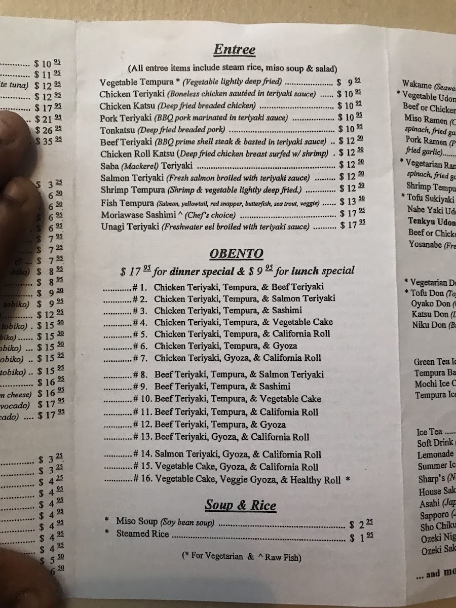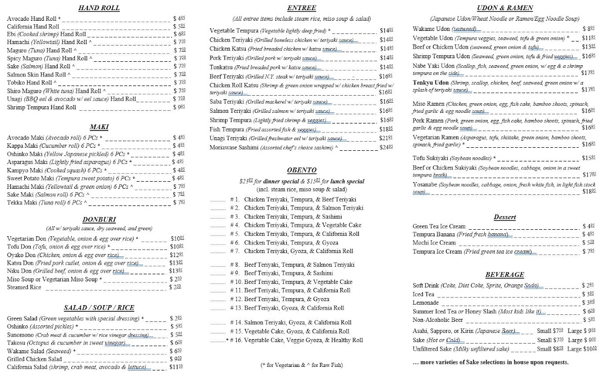 - Beverages: The beverage selection includes standard soft drinks like Coke, Diet Coke, 7 Up, and root beer, along with lemonade, iced tea varieties, nonalcoholic beer, and Japanese alcoholic options such as house sake and beers including Sapporo, Kirin, and Asahi. Sangria is also featured as a menu highlight.